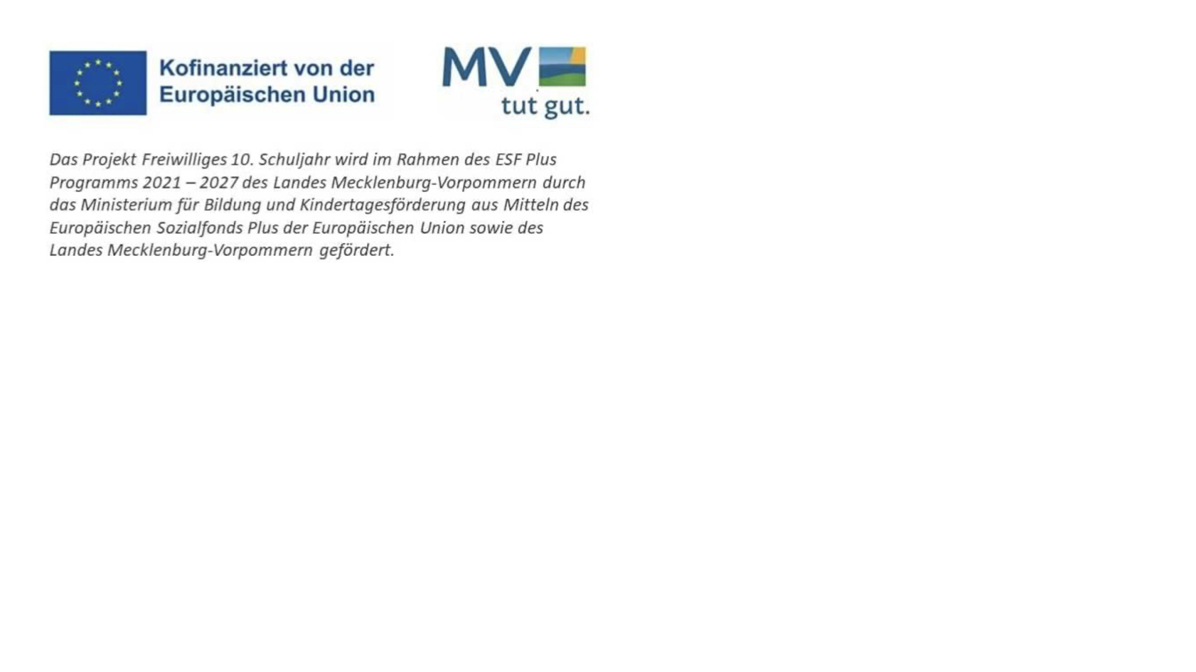 Seit dem Schuljahr 2023/2024 wird das freiwillige 10. Schuljahr nicht mehr an Förderschulen, sondern an Regionalen Schulen und Gesamtschulen angeboten. Dadurch erhalten mehr Schülerinnen und Schüler die Möglichkeit, dieses Angebot wahrzunehmen. Die Finanzierung des landesweiten Projekts ist bis 2028 gesichert und erfolgt mit insgesamt 24 Millionen Euro aus dem Europäischen Sozialfonds Plus (ESF Plus) sowie durch das Land Mecklenburg-Vorpommern.